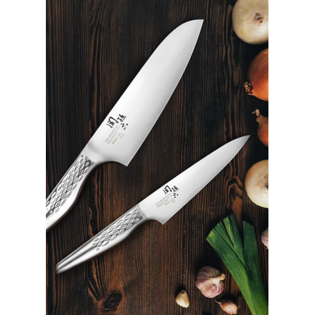 Elegant och Hållbart: Upptäck skönheten och styrkan hos KAI Seki Magoroku knivset, tillverkat av högkvalitativt rostfritt stål. Dessa knivar är utformade för att tåla daglig användning och erbjuder både skarphet och hållbarhet. Handtagets ergonomiska design glider perfekt tillsammans med det satinbelagda bladet för optimal komfort och kontroll.