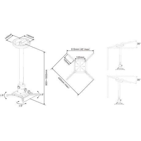 Universellt, vitt takfäste för projektorer med justerbar 900 – 1600 mm arm. Se produktbilden för mått och mångsidiga justeringsmöjligheter.