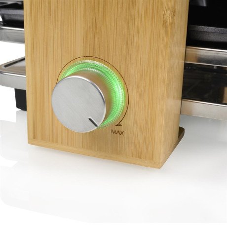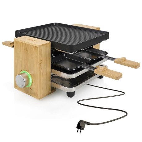 Njut av en utsökt middag med familj eller vänner i ren lyx med Princess 162950 Raclette Pure 4. Efter användning kan du säkert och enkelt förvara pannorna i det unika parkeringsfacket, så att de aldrig är i vägen. Designad för 4 personer och med lyxiga detaljer i naturligt bambu, är denna raclette en riktig blickfångare i ditt kök!